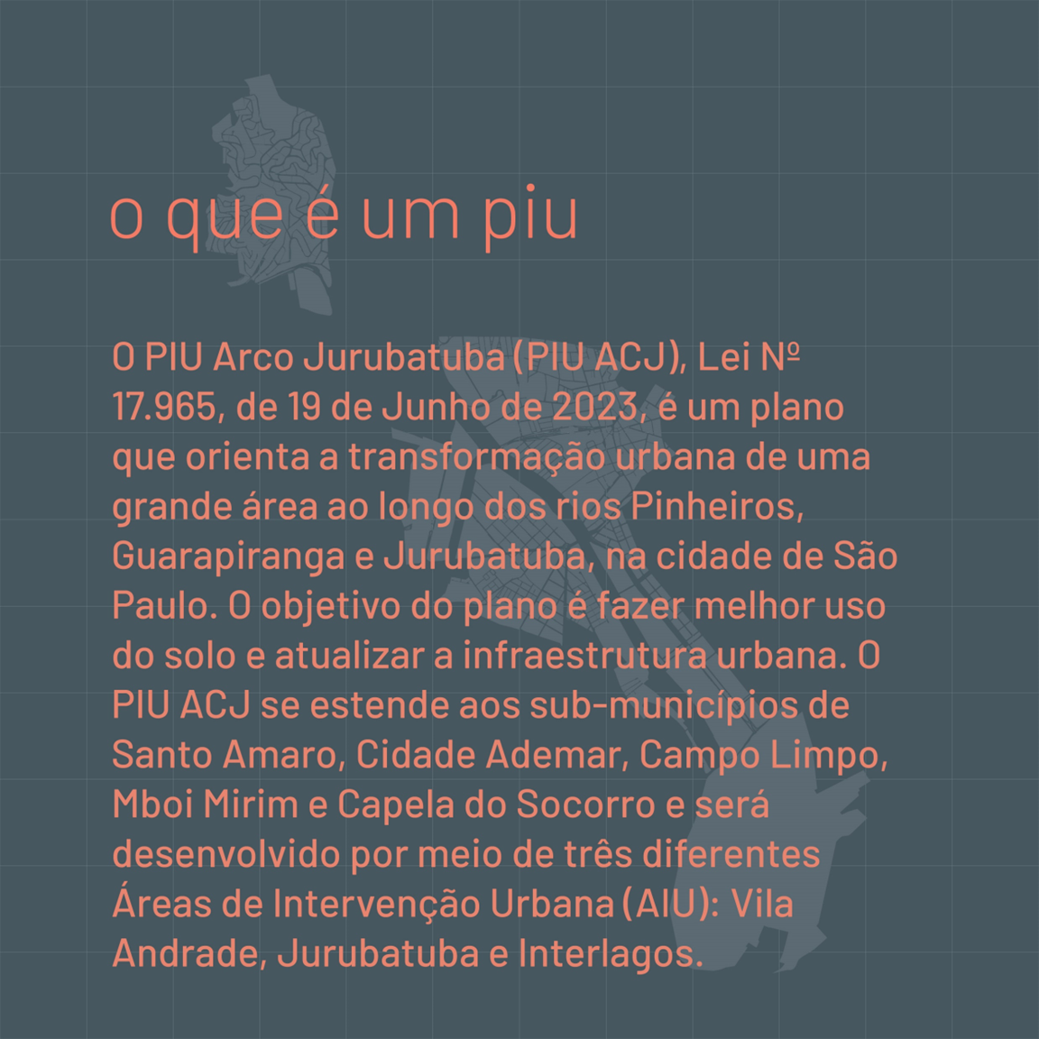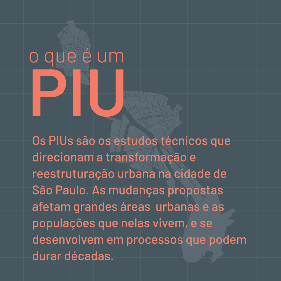 Os Planos de Intervenção Urbana (PIUs) são os estudos técnicos que direcionam a transformação e reestruturação urbana na cidade de São Paulo. As mudanças propostas afetam grandes áreas urbanas e as populações que nelas vivem, e se desenvolvem em processos que podem durar décadas.